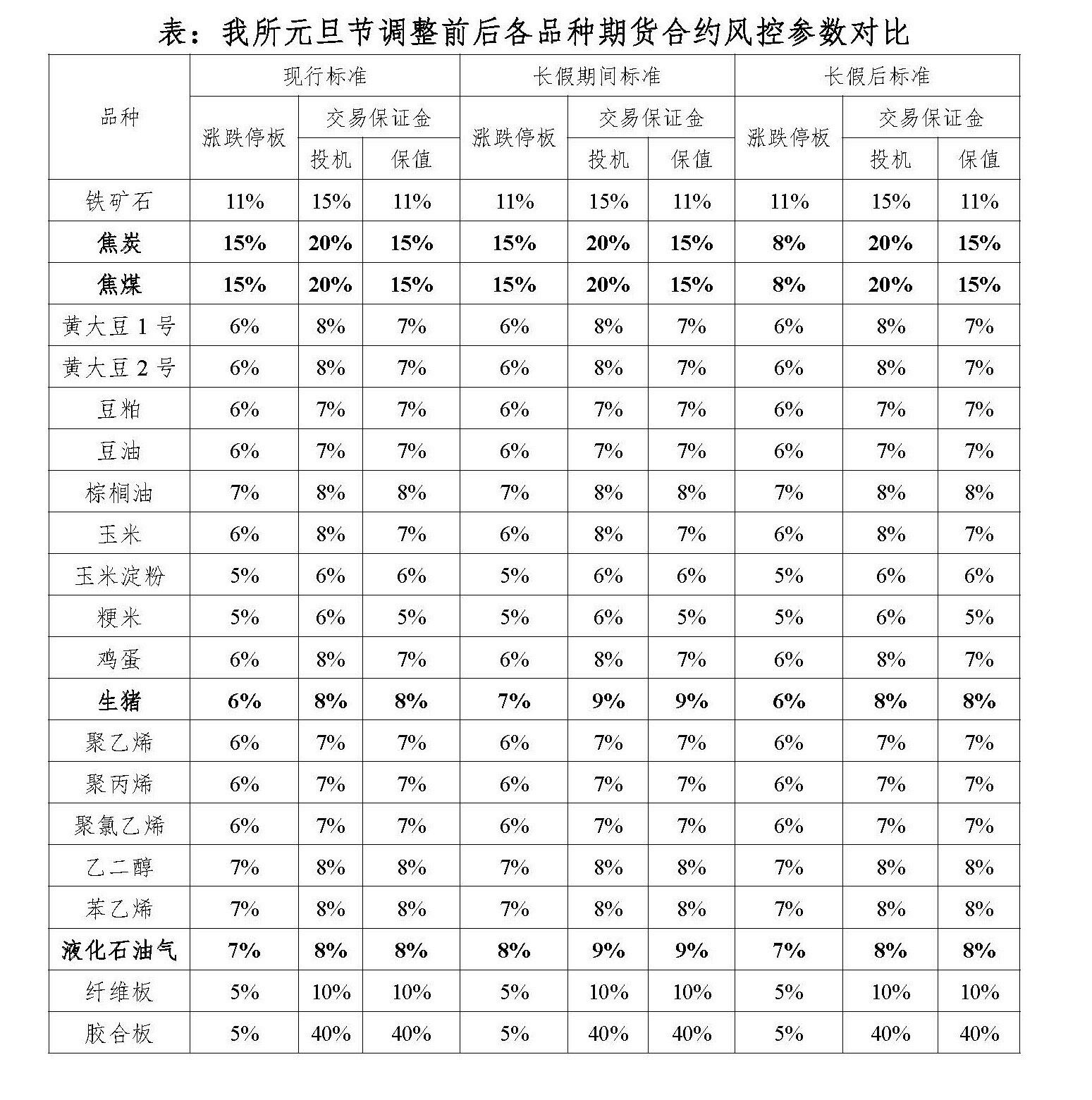 根據(jù)《大連商品交易所風險管理辦法》,經(jīng)研究決定,我所將在2024年元旦節(jié)休市前后對各品種期貨合約漲跌停板幅度和交易保證金水平做如下調(diào)整: