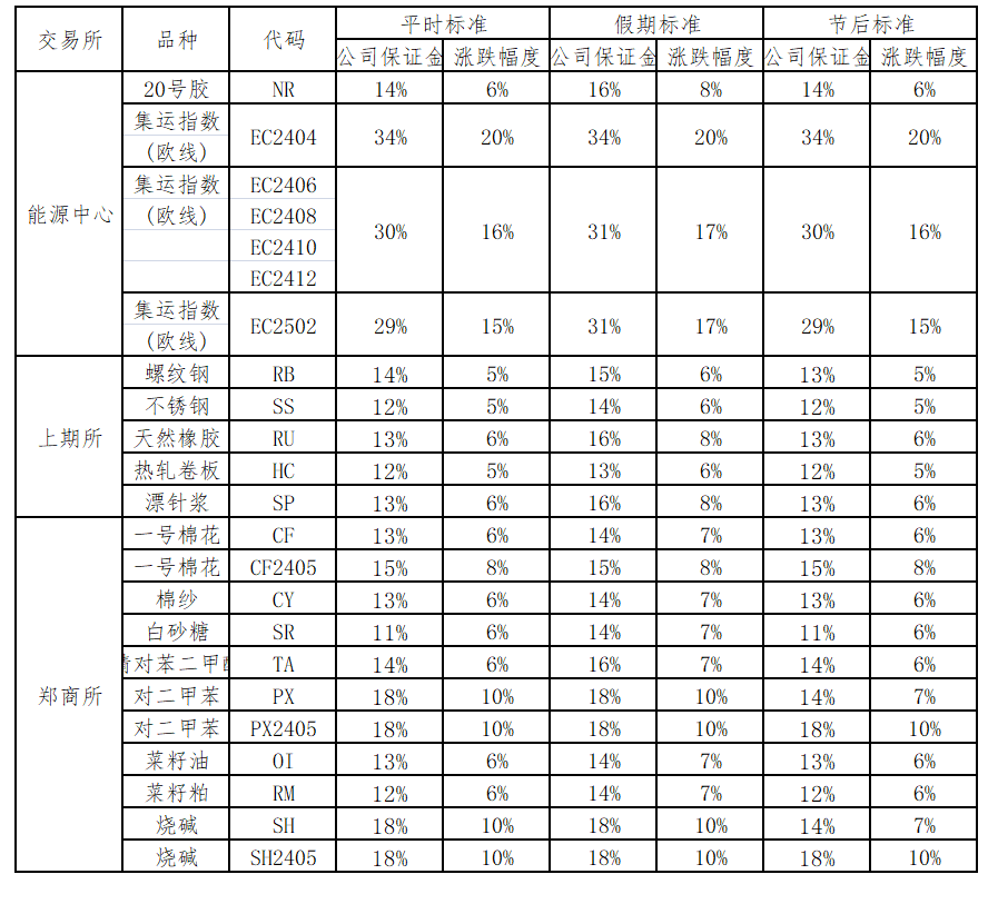 關(guān)于2024年清明假期調(diào)整部分品種交易保證金及漲跌停板幅度的通知