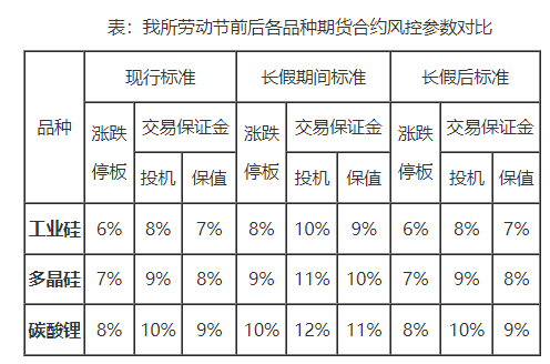 根據(jù)《廣州期貨交易所風(fēng)險(xiǎn)管理辦法》,經(jīng)研究決定,交易所將在2025年勞動(dòng)節(jié)假期休市前后對(duì)各品種期貨合約漲跌停板幅度和交易保證金標(biāo)準(zhǔn)做如下調(diào)整: